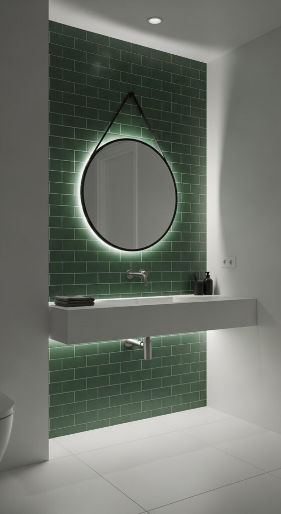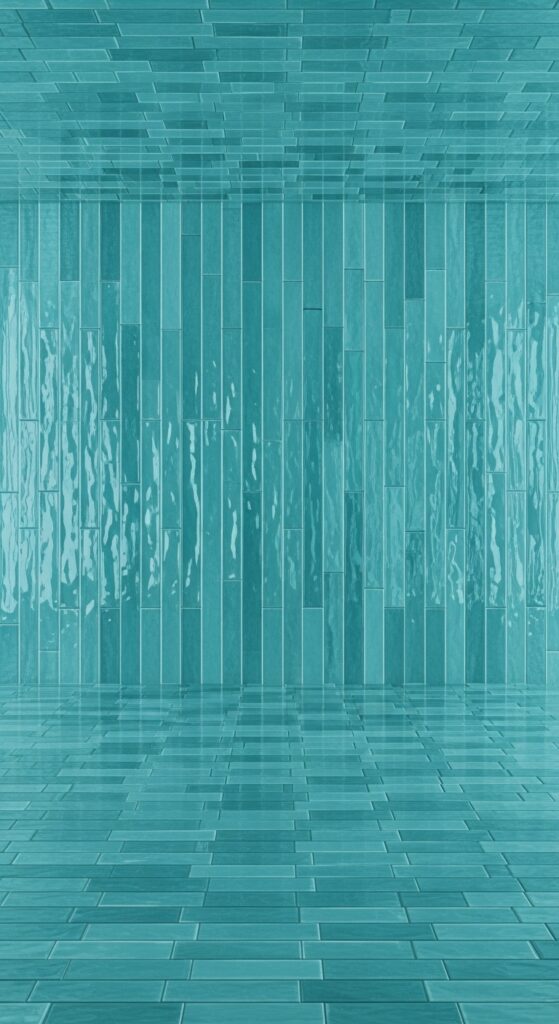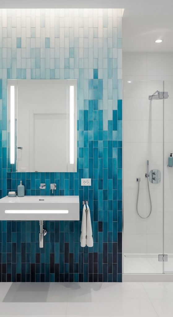 This trend uses highly glossy, elongated tiles in shimmering watery colors (like aqua or seafoam) applied in a vertical pattern. The tiles capture and reflect light in a way that mimics the movement of water, creating an expansive, “dreamy” atmosphere. This effect visually pushes back the walls, making a narrow bathroom feel wider. It provides a soothing, immersive environment that is perfect for relaxation after a long day.