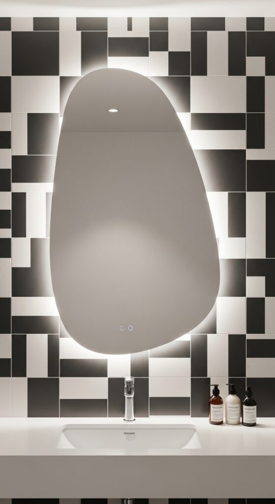 Break free from rigid squares and circles! Playful oval and organic-shaped mirrors are a defining feature of 2026 bathroom aesthetics. These mirrors use soft, curved silhouettes to counteract the sharp lines of geometric tiles. An elongated, asymmetric oval mirror acts as a unique vertical focal point that can make a low ceiling feel higher. Their organic curves soften the overall environment, creating a space that is modern yet inviting.