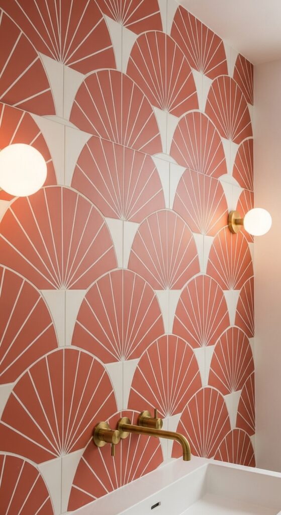 Art Deco is back, but with a sleek, 2026 twist. Think of classic fan or “fizz” patterns reimagined in modern color palettes like soft coral red and cream. Instead of busy mosaics, these tiles use larger scales and matte finishes to keep the look clean and contemporary. This trend offers a sense of structured luxury and nostalgic charm that feels both comforting and cutting-edge. It pairs beautifully with minimalist brass hardware.