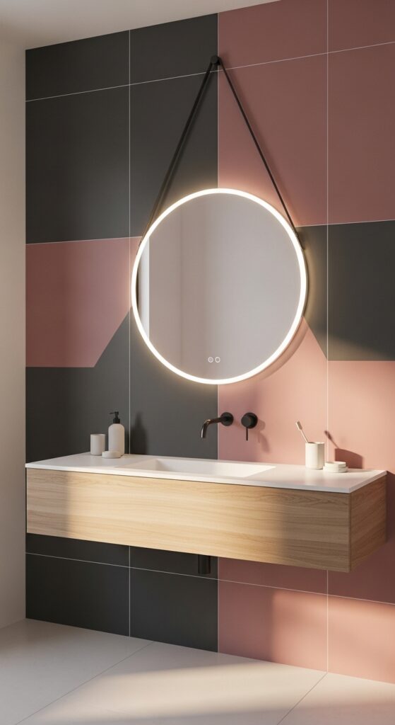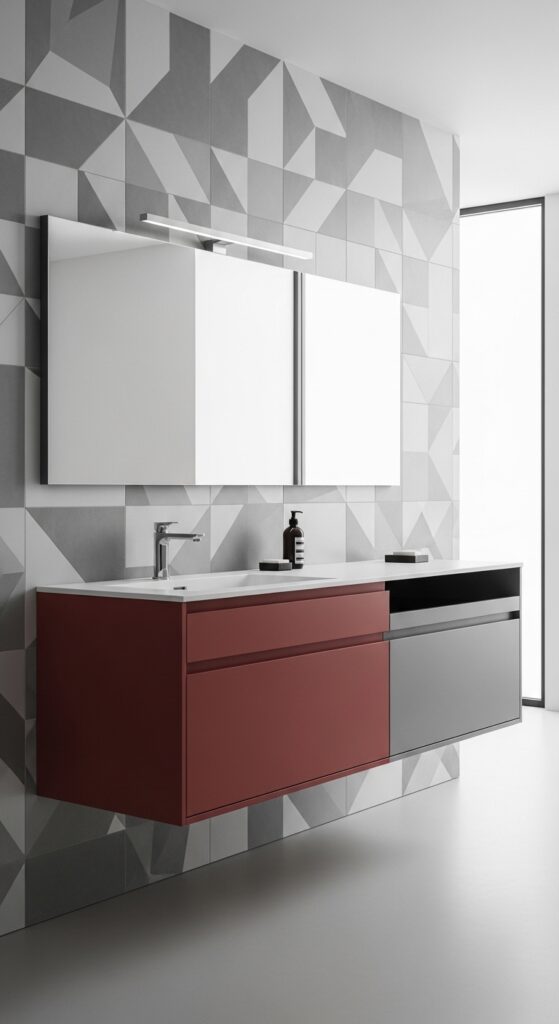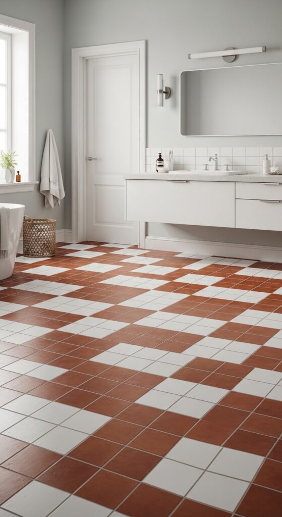 Classic checkered floors are being reinvented. Instead of standard black and white, we see combinations like soft terracotta and white, or navy blue and grey. This retro-fusion look offers nostalgic charm but is executed in modern, matte materials and larger tile scales. It provides a structured, playful pattern that hides imperfections and anchors the room, pairing beautifully with modern, minimalist vanities for a “transitional” aesthetic.
