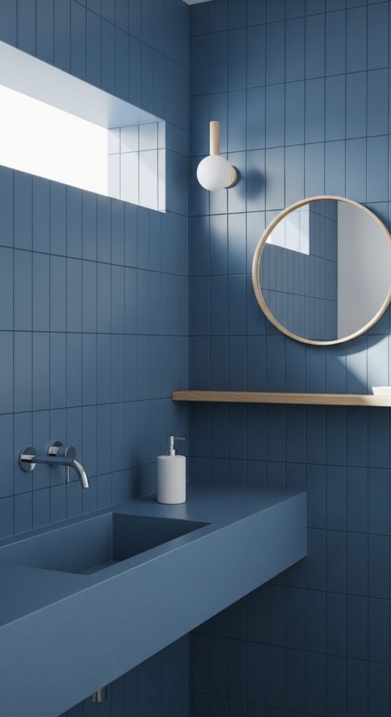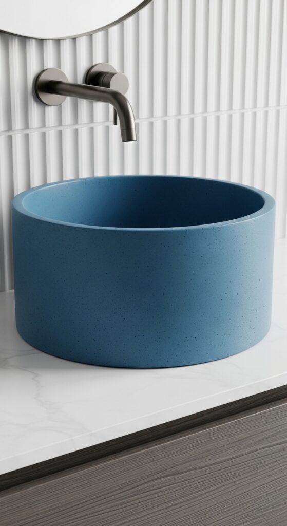 While technically not a tile, the matte concrete vessel sink is the essential companion to these bold tile trends. This design replaces shiny white porcelain with textured, cylindrical sinks in industrial shades like deep azure blue or burnt terracotta. These sinks are tactile art pieces that ground the playful tile patterns. They bring a necessary “hardness” and modernity to the space, balancing out the sweetness of pastel colors and ensuring the bathroom feels grounded and contemporary.