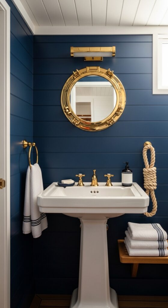 To execute this, install a porthole-style mirror and use rope-trimmed baskets for storage. The towels should be thick, navy-and-white cabana stripes. Lighting is crucial here; use brass sconces with white globe shades to mimic traditional maritime lamps.