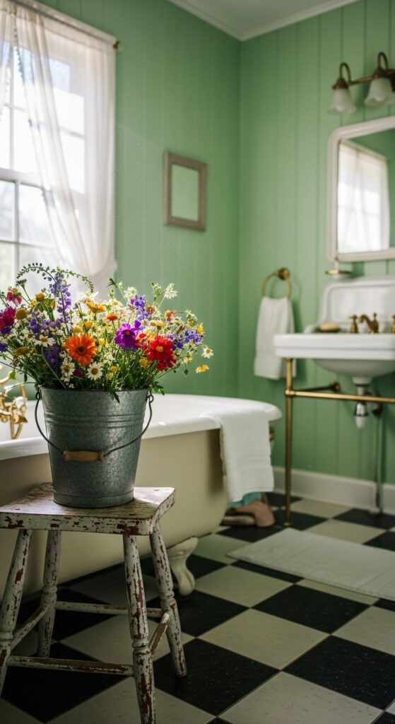 Use galvanized buckets as wastebins or towel holders. Hang botanical sketches in simple wood frames and swap your standard rug for a checkered green-and-cream mat. Finish with striped cafe curtains for the windows to provide privacy while letting in soft, dappled light.