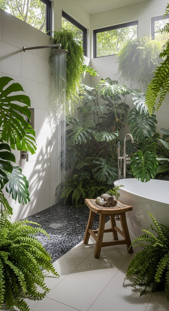 The lifestyle benefit here is rejuvenation. Being surrounded by plants has been scientifically proven to boost air quality and improve mood. The rainfall showerhead and pebble flooring provide a tactile experience that mimics a natural waterfall, washing away the heat of the summer day.