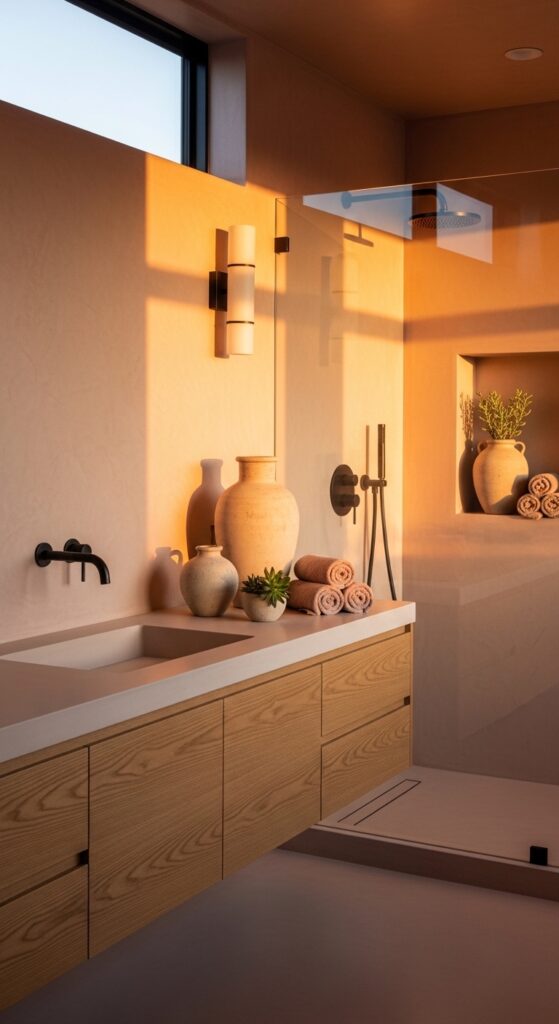 • PRO-DESIGNER TIP: Hang a bundle of dried eucalyptus behind your showerhead; the steam will release a scent that perfectly complements the desert aesthetic.