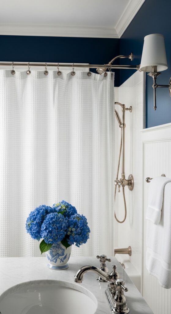 Focus on textural layering. Use a navy-blue vanity as your anchor, and layer in white waffle-weave shower curtains. Add a ginger jar to the vanity to serve as a vase for fresh white hydrangeas. The key is symmetry; use matching sconces and aligned frames for indigo Batik prints.