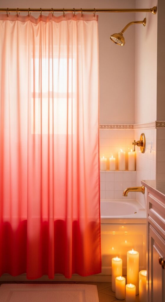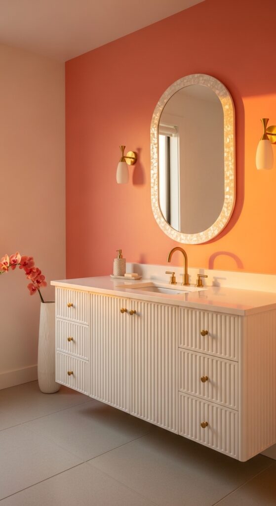 Capturing the colors of a summer sunset, this look uses gradient transitions from peach to deep coral. The visual concept is soft, glowy, and ethereal, making the bathroom feel like it’s permanently bathed in the light of a July evening.
