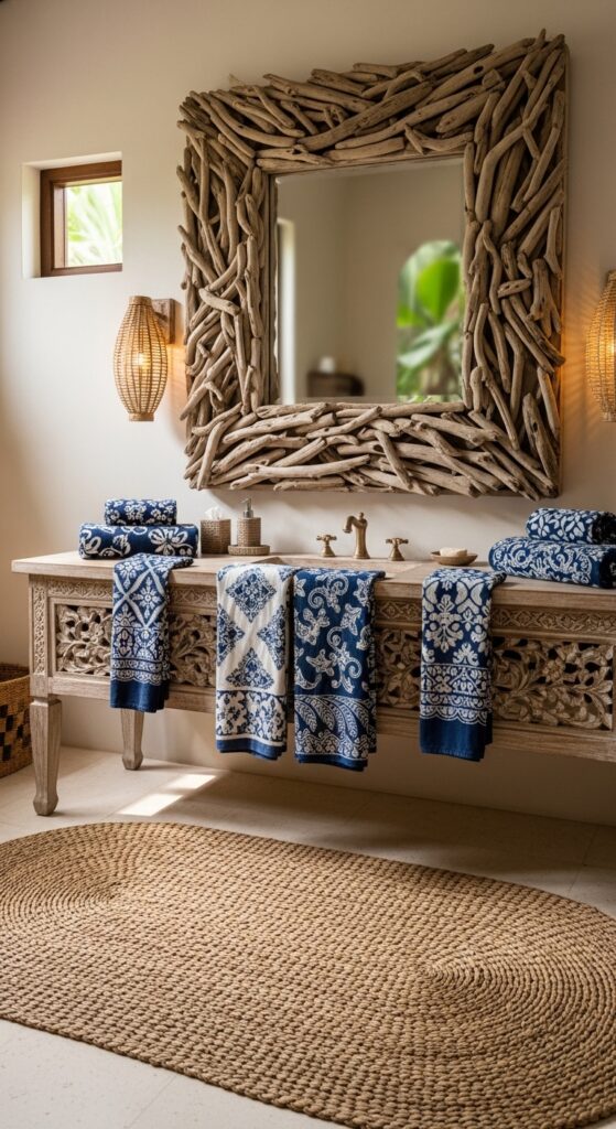 Use Batik-print hand towels and a shabby-chic driftwood mirror. The shower curtain should be a heavy navy cotton with fringe details. Add a woven seagrass rug to the floor for a hit of organic texture that feels amazing underfoot.
