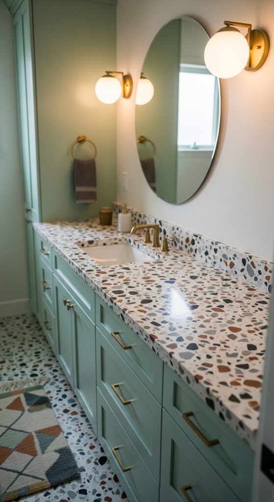 If you don’t want to replace your counters, use terrazzo bathroom accessories (soap dish, toothbrush holder). Pair them with a mint-green bath mat and round brass knobs on your existing vanity. A white globe pendant light completes the mid-century glow.