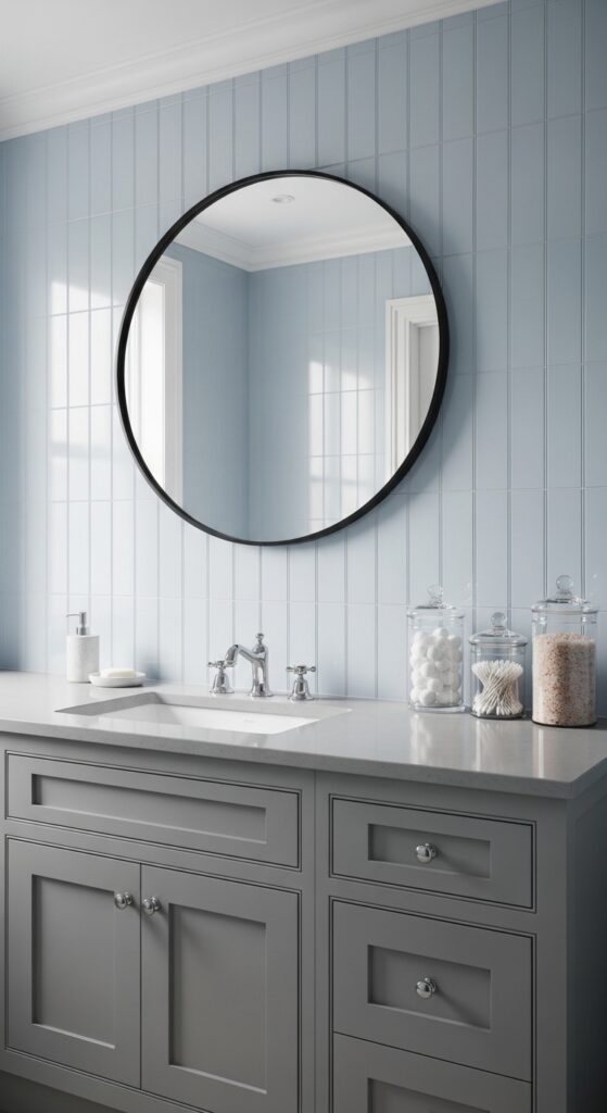 This is a quiet, airy, and refined take on the coast. The visual concept uses mist-gray walls and powder-blue Shaker-style cabinets. It avoids the “kitsch” of traditional beach decor in favor of a more understated elegance.