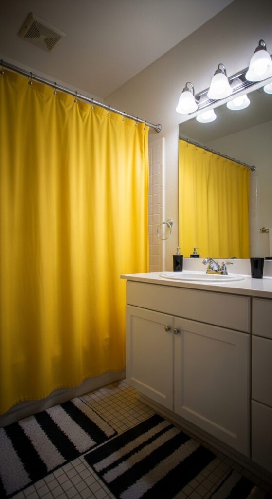 Use hookless curtain rings for a clean, modern line on your striped shower curtain. Add chrome globe sconces for a retro-modern touch. The artwork should be splashy and fun—think vintage surfboard photography or pop-art umbrellas.