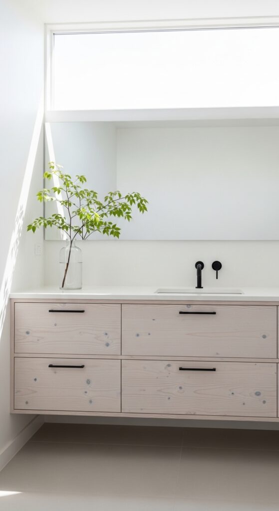 Keep the vanity completely clear except for one sculptural plant or a single branch in a clear carafe. Use large-format stone tiles to minimize grout lines and create a seamless look. The towels should be ecru waffle-knit, which are both absorbent and visually lightweight.