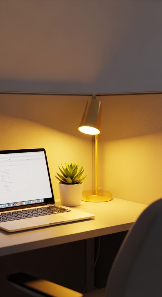 Fluorescent overhead lights are the enemy of “cozy.” The first step in any cubicle makeover is adding a dedicated desk lamp with a warm-toned LED bulb. Choose a lamp with a gold or matte black finish to add a touch of sophistication. This creates a “pool of light” that defines your workspace and makes the surrounding grey walls fade into the background. Visually, this is the #1 thing that makes a cubicle look high-end on Pinterest.