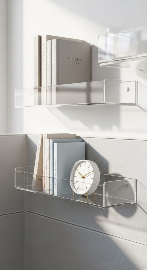 If your cubicle allows for wall attachments, acrylic “invisible” shelves are a game-changer. They provide extra storage for small decor items without adding visual weight. You can display a few aesthetic books, a designer candle (unlit, of course), or a small clock. The transparency of the acrylic keeps the cubicle feeling open and airy, which is vital in a small, enclosed space.