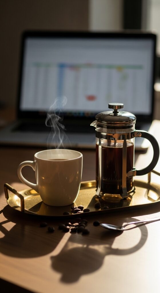 If you’re a caffeine lover, dedicate one corner of your desk to a beautiful tray holding a stylish mug, a small French press, or a collection of gourmet tea bags. Using a gold or wooden tray keeps everything organized and makes your morning coffee feel like a ritual rather than a chore. It’s a functional piece of decor that adds a “home-like” hospitality vibe to your cubicle.