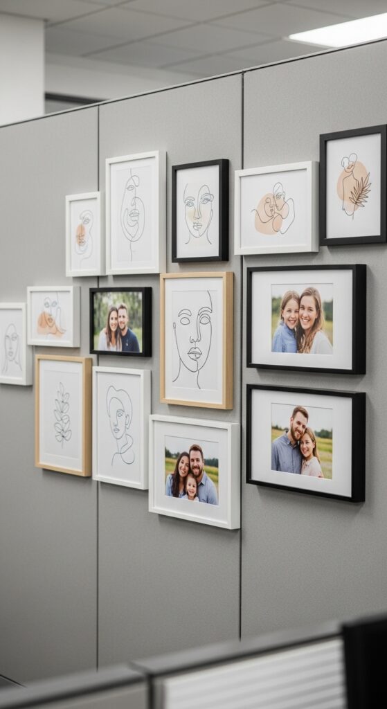 Instead of taping up messy photos, use matching frames to create a small gallery wall. Mix personal photos with motivational quotes or minimalist line art. Frames give your personal life a professional “border,” making the decor feel curated rather than cluttered. This setup tells a story of who you are outside of work, which helps you feel more grounded and less like a “cog in the machine.”