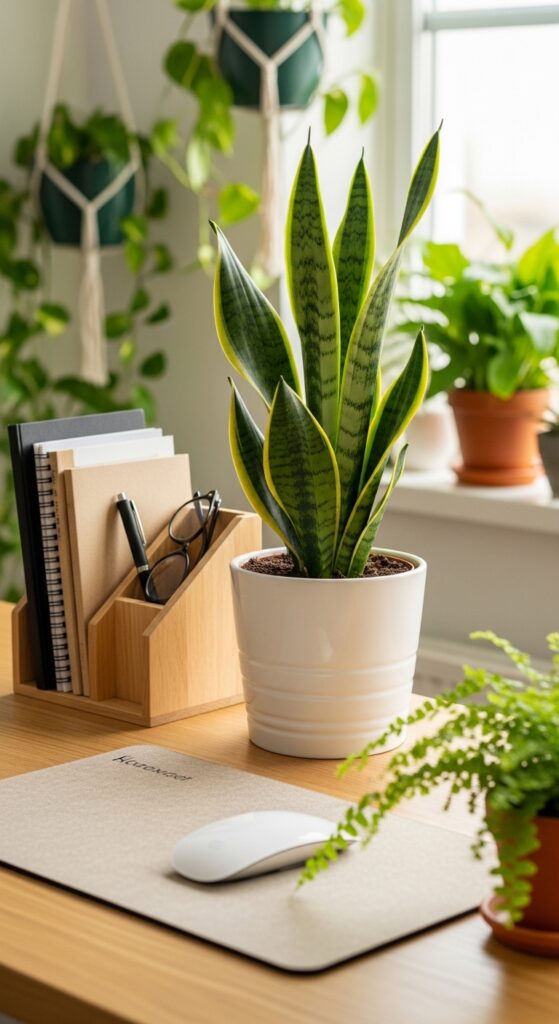 Nothing brings life to a cubicle like greenery. Since most cubicles have low light, opt for a Snake Plant, a ZZ plant, or a small pothos in a stylish white ceramic planter. These plants don’t just look great; they actually help purify the stale office air. The contrast of organic green leaves against the rigid lines of office equipment provides a much-needed visual break for your eyes during long shifts.