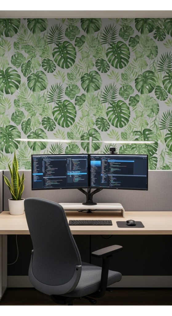 Those fabric cubicle walls are often dull and stained. Use peel-and-stick wallpaper in a subtle linen texture or a light botanical print to cover the back wall of your cubicle. It’s completely reversible and instantly changes the vibe from “temporary station” to “designed office.” Imagine a soft sage green or a light marble pattern behind your dual monitors—it creates a clean, intentional look that makes your screen pop.
