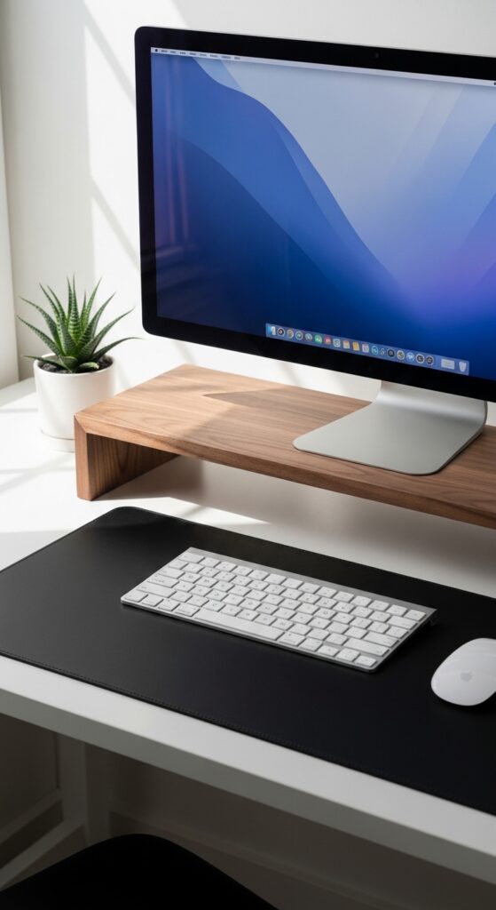 Instead of a stack of books, use a dedicated wood or aluminum stand for your monitor or laptop. Raising your screen is better for your neck (ergonomics!) and creates a “storage nook” underneath for your keyboard when you aren’t using it. A walnut wood stand adds a rich, organic warmth that perfectly balances out the metallic look of laptops and monitors.
