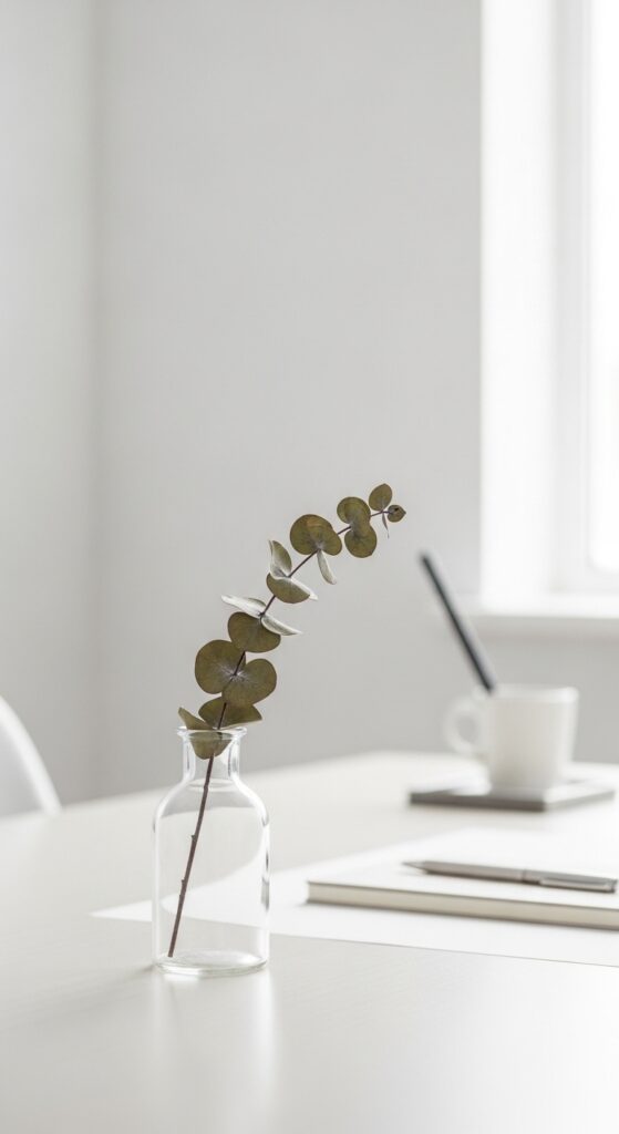 Keep a small bud vase on your desk and fill it with one or two fresh flowers or a sprig of dried eucalyptus. Fresh flowers add a natural scent and a pop of color that changes your desk’s mood every week. Dried eucalyptus is particularly great for cubicles because it lasts forever and maintains a beautiful, muted green color that looks great in a minimalist setting.