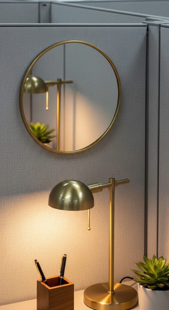 Adding a small, round gold-framed mirror to one of your cubicle walls can make the space feel twice as large. It reflects the light from your desk lamp and breaks up the solid wall surface. Plus, it’s practical for a quick check before a meeting! From a design perspective, a mirror adds a touch of elegance usually reserved for living rooms, bringing that “homey” feel into the office.