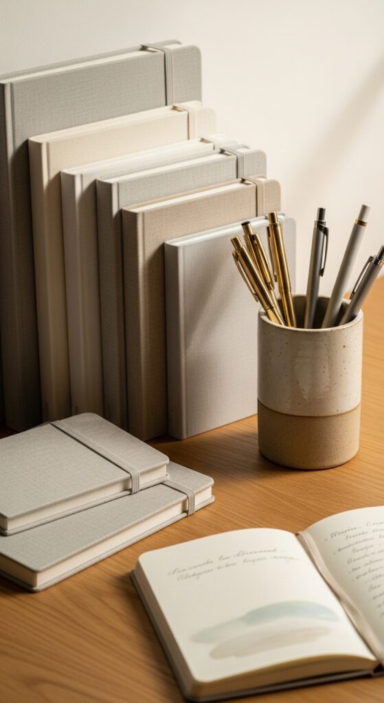 Ditch the cheap plastic pens. Invest in a set of high-quality metal pens, a linen-covered notebook, and a ceramic pen holder. When the tools you touch every day feel expensive and well-made, it elevates your work experience. Visually, a coordinated stationery set in neutral tones (like beige, gold, or sage) creates a cohesive, high-end look that is very “boss-babe” chic.
