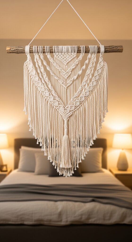 If your walls are too thin for heavy frames, go for textiles. A large macrame wall hanging or a vintage tapestry adds incredible texture and a “soft” acoustic to the room. They are very lightweight and can be hung with a single tiny pin or an adhesive hook. Textile art makes a room feel quiet and cozy, which is exactly what you want in a bedroom retreat.