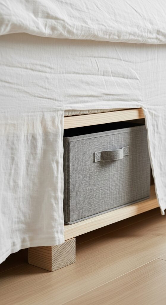 Storage is the biggest struggle for renters. Use heavy-duty bed risers to lift your bed frame by 5 to 7 inches. This creates a massive amount of hidden storage space underneath for off-season clothes or extra linens. To keep it aesthetic, use a long, floor-length bed skirt (also known as a dust ruffle) to hide the boxes. This keeps the room looking clean and organized while maximizing every square inch.