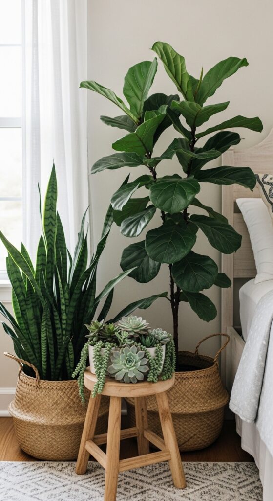 Rental rooms often lack “life.” Bringing in large, indoor plants like a Bird of Paradise or a Fiddle Leaf Fig instantly changes the energy. Place a large plant in a corner in a beautiful woven seagrass basket. Pair it with two smaller plants at different heights to create a “green cluster.” Plants soften the harsh corners of a room and act as natural air purifiers, making your sanctuary feel fresh and organic.