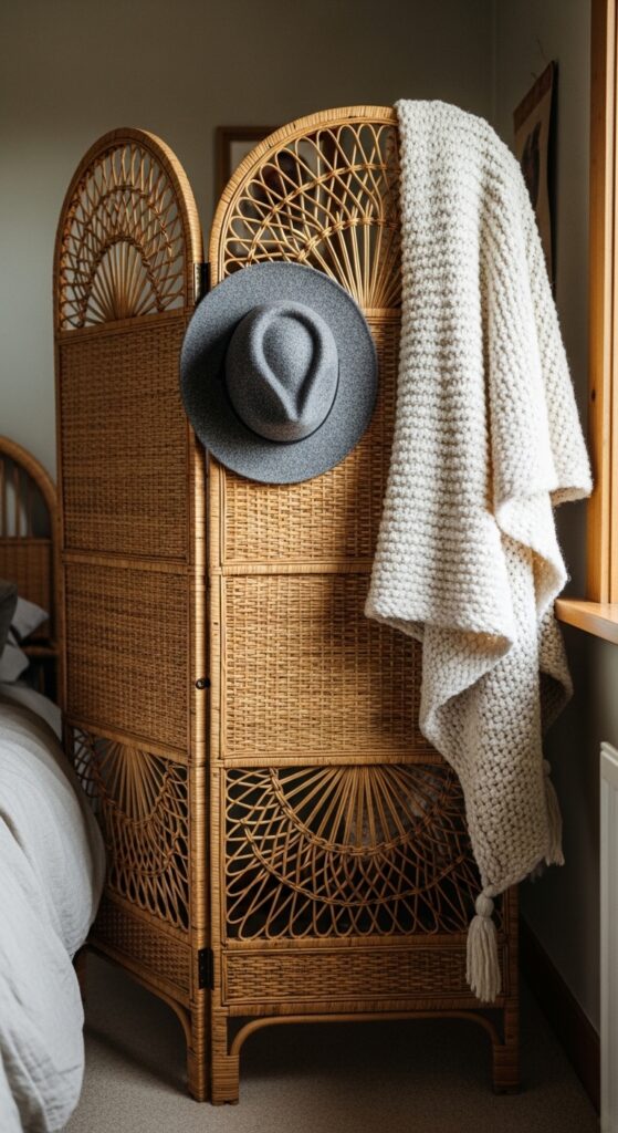 A rattan or wooden folding screen is a fantastic way to hide an ugly corner or a radiator. It adds height and texture to the room without any installation. You can even drape blankets or hang a hat collection on the screen. It creates a “layered” look that makes the room feel curated rather than just furnished. When you move, you simply fold it up and take it with you.
