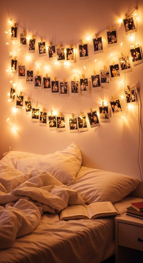 For a “boho-chic” or “dreamy” aesthetic, string lights are essential. Instead of a single lamp, drape warm-toned fairy lights across your ceiling or along a wall. Use tiny wooden clips to hang polaroid photos or postcards along the wire. This creates a personalized, glowing wall of memories that acts as both lighting and art. It’s an inexpensive way to add a ton of personality and a “lived-in” warmth to your bedroom.