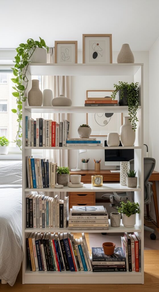 In studio apartments or large bedrooms, you often need to define different zones. A tall, open-backed bookshelf (like the IKEA Kallax) can be used as a non-permanent wall between your sleeping area and your desk. Because it’s open, it doesn’t block the light, and you can fill it with a mix of books, decorative baskets, and trailing plants. It creates a “nook” feeling for your bed, making it feel more private and cozy.