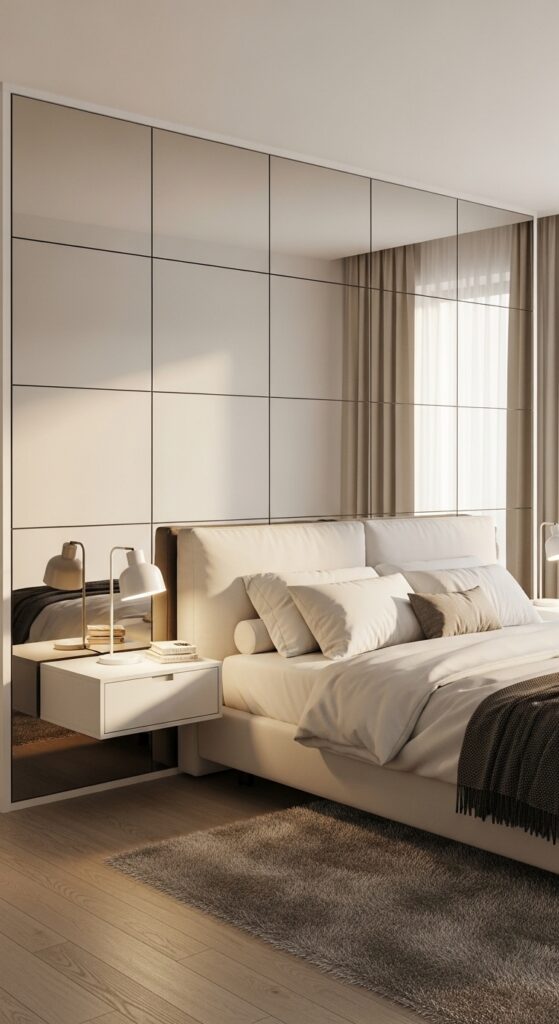 Many rental bedrooms have plain, white sliding closet doors that look like a blank void. You can apply lightweight adhesive mirror tiles to these doors to create a custom “mirrored closet” look. Not only does this add a functional full-length mirror to your room, but it also bounces light around the space, making the bedroom feel much brighter and more expensive. It turns a boring utility feature into a sleek design element.