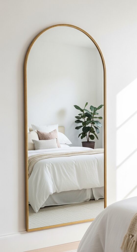 Drilling into walls for a heavy mirror is risky. Instead, opt for a large, arched floor mirror and lean it against the wall. This is a classic designer trick that makes a small bedroom feel twice as large by reflecting light and space. A gold-framed mirror leaning in a corner with a pile of books or a plant nearby creates a beautiful “vignette” that looks incredible in photos and adds a sense of grandeur to the room.