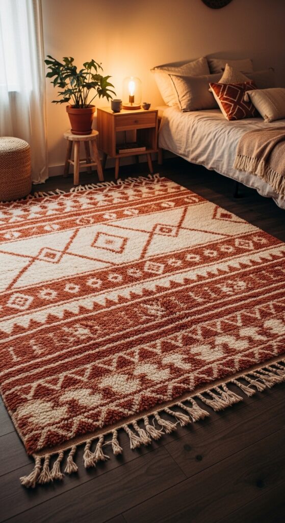 Whether your rental has scratched hardwood or stained beige carpet, an oversized area rug is your best friend. A large, plush rug in a Moroccan or Persian pattern can cover up 80% of an ugly floor while adding a much-needed layer of comfort underfoot. Ensure the rug is large enough so that at least the front legs of your bed and side tables sit on it; this “anchors” the room and makes the furniture feel like it belongs in the space.