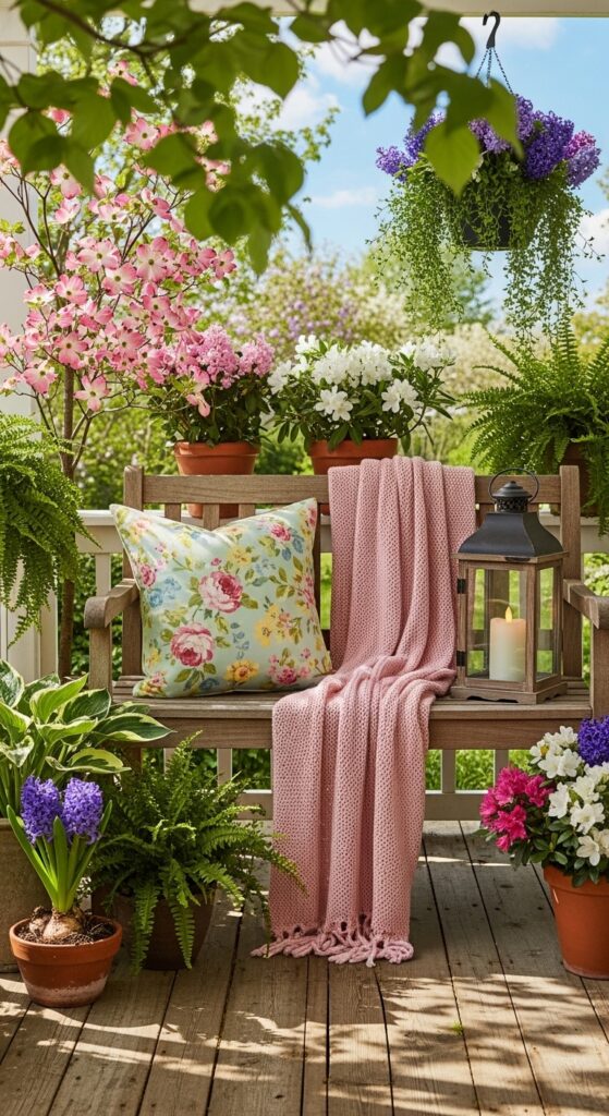 If you have a porch or balcony, extend your Easter decor outside. Add a few outdoor pillows in soft greens or floral patterns and a light knit throw for chilly spring evenings. A small lantern with a battery-operated candle and some faux ivy can make the space feel magical. Picture a wooden bench with a soft pink throw and a small side table holding a vase of tulips. This creates an inviting “outdoor room” where you can enjoy the fresh spring air, making your entire property feel like part of the celebration.