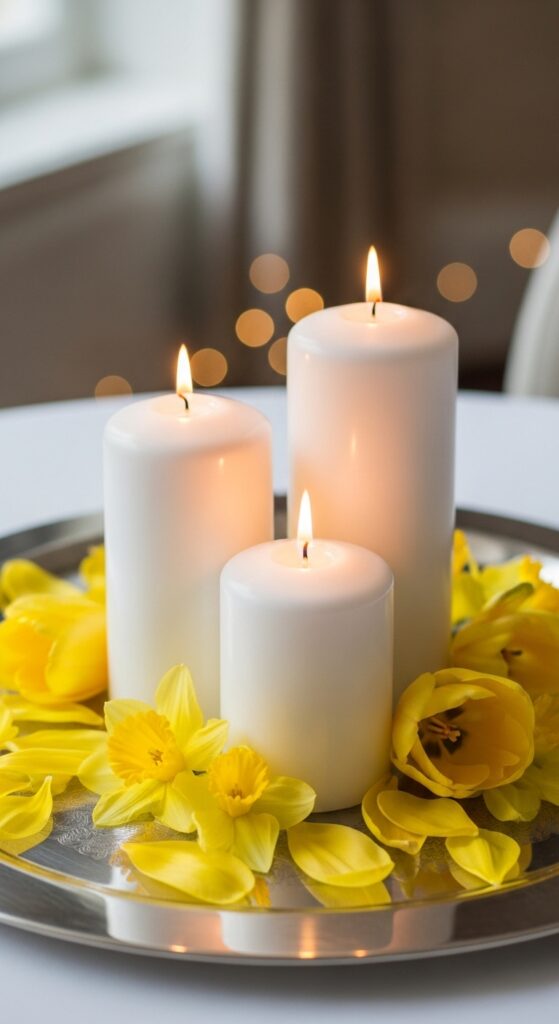 Ambience isn’t just about what you see; it’s about what you smell. Switch out heavy winter scents like cinnamon and pine for fresh, floral, or citrus notes. Scents like lemon grass, lily of the valley, or fresh linen make your home feel clean and airy. Visualize a cluster of white pillar candles of varying heights on a silver tray, surrounded by small yellow petals. When lit, the soft glow combined with a light floral scent creates a multi-sensory experience that makes your home feel like a high-end spa during the spring season.