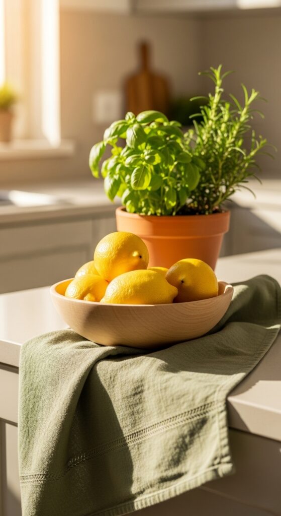 We spend so much time in the kitchen, so don’t leave it out. Replace your regular tea towels with ones featuring spring motifs like herbs or soft stripes. Place a small pot of live grass or a tray of wheatgrass on the counter to hold your salt and pepper shakers. Imagine a bright, sun-drenched kitchen with a sage green tea towel draped over the oven handle and a small wooden bowl filled with lemons on the island. These small, functional changes make the heart of your home feel festive and refreshed for daily use.