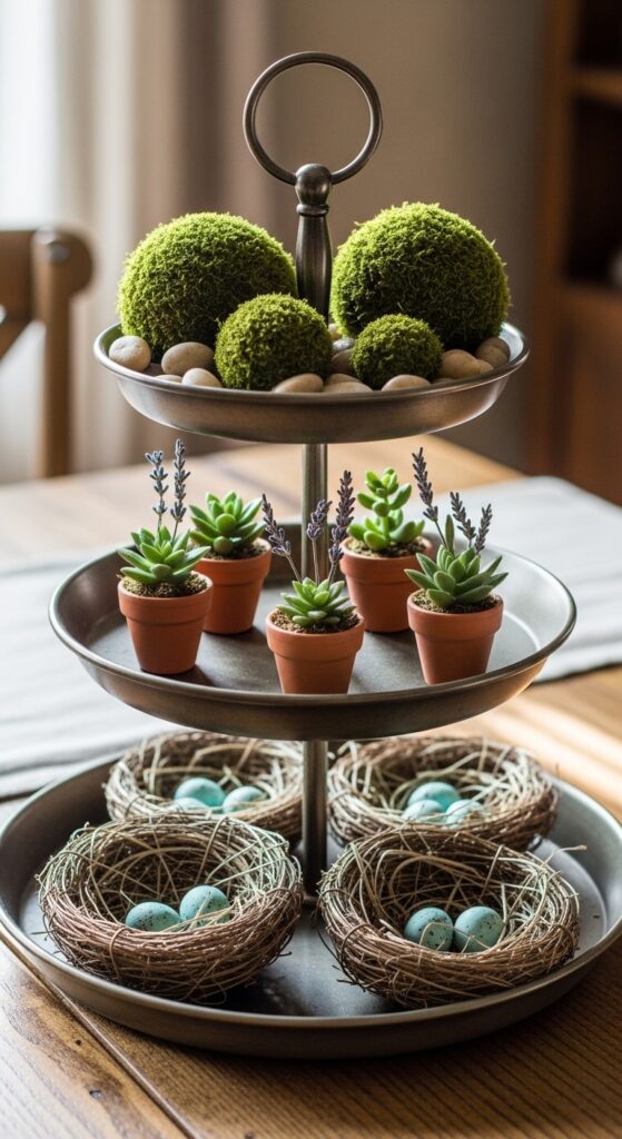 Tiered trays are a decorator’s best friend because they allow you to tell a story in a small space. On an Easter-themed tray, mix textures like a small moss ball, a ceramic bunny, a tiny sign with a spring quote, and a few speckled eggs. Imagine a three-tiered galvanized metal tray sitting on your coffee bar, featuring mini terracotta pots with succulents and small nests of straw. This allows you to group small items together so they look like a deliberate collection rather than random clutter, perfect for close-up Pinterest photography.