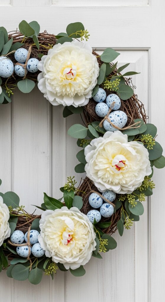 Your front door is the first impression guests have, so make it count with a lush Easter wreath. Move away from plastic-looking greenery and opt for natural materials like dried grapevine, eucalyptus, or silk peonies. Adding small, speckled artificial eggs tucked into the foliage adds a touch of whimsy without looking childish. Think of a thick, green mossy wreath base with delicate white lilies and small blue eggs scattered throughout. It’s a visual treat that signals the arrival of spring before anyone even steps inside your home, making it a perfect focal point for visitors.