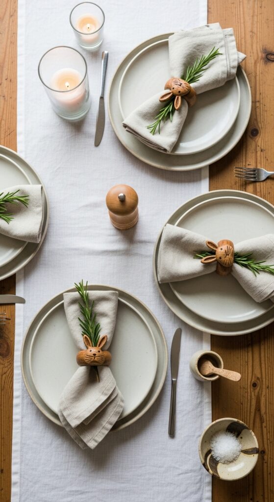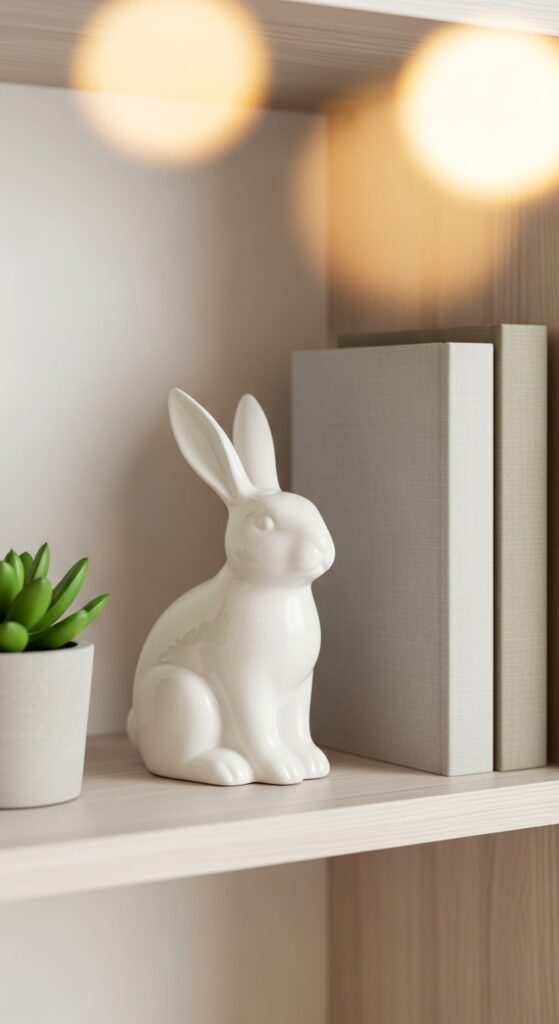Bunnies are essential for Easter, but the key is “less is more.” Look for minimalist silhouettes in materials like gold-dipped ceramic, carved wood, or even white porcelain. Scatter these small figures on bookshelves, mantels, or tucked inside your indoor potted plants. Visualize a sleek, white porcelain bunny sitting quietly next to a stack of linen-bound books and a small succulent. This subtle nod to the holiday adds character and charm without cluttering your space, maintaining a clean and professional aesthetic while still feeling festive and fun for children.