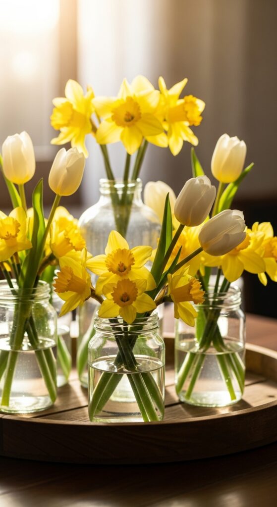 Nothing says spring like fresh flowers. For an impactful centerpiece, mix different heights of glass jars and fill them with tulips, daffodils, or daisies. You can even place small carrots with their green tops still attached inside clear vases for a playful, organic look. Imagine a long wooden trough filled with moss, nestled with white tulips and small glass votives for a soft evening glow. This brings the beauty of the outdoors inside, providing a fresh scent and a vibrant visual that anchors your entire dining or living room setup.