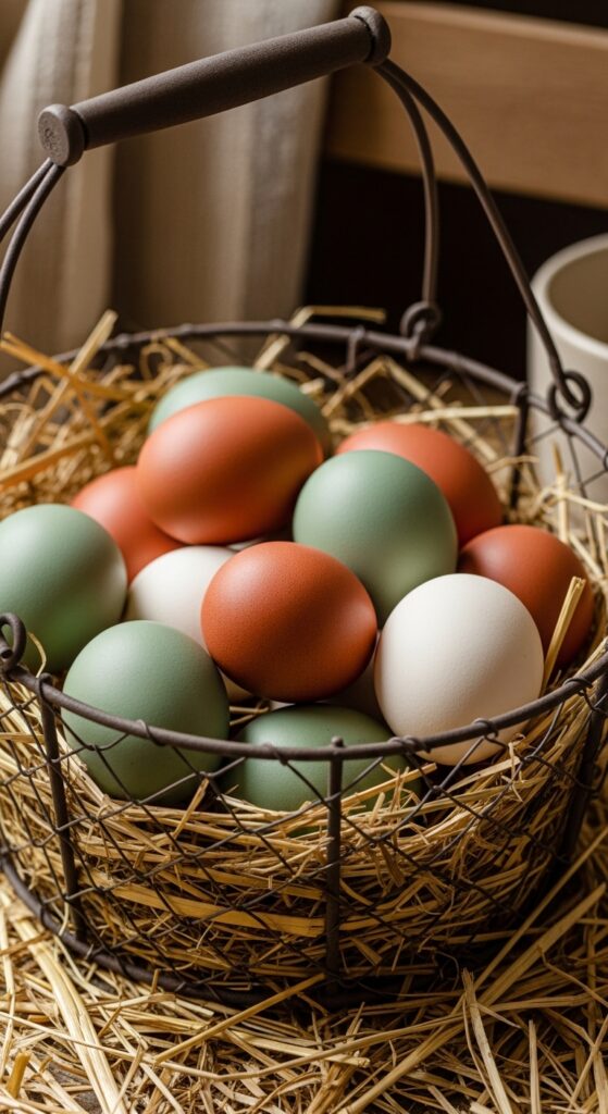 Eggs are the ultimate symbol of Easter, but you can display them with a modern twist. Instead of bright neon colors, try wooden eggs, ceramic eggs, or hand-painted ones in matte finishes. Place them in a vintage wire basket or a beautiful marble bowl on your coffee table. Picture a collection of matte terracotta and sage green eggs resting on a bed of dried straw inside a rustic bowl. This adds texture and a “designer” feel to your decor, making it look carefully curated rather than just tossed together for the holiday.
