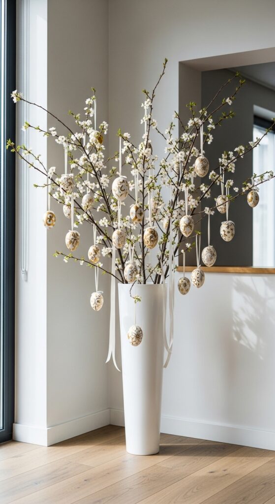 An Easter tree (or Ostereierbaum) is a stunning way to display ornaments. Find some large, sturdy branches—pussy willow or cherry blossoms work best—and place them in a heavy floor vase. Hang lightweight, painted eggs or small wooden ornaments from the twigs. Imagine tall, dark branches against a light-colored wall, decorated with delicate hand-painted eggs in shades of gold and cream. It creates a vertical interest in the room and acts as a sculptural piece of art that guests will definitely ask about during your Easter gatherings.