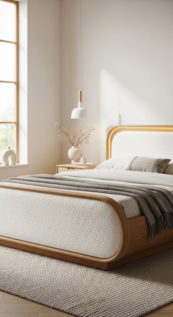 For those who love the feel of fabric but the look of wood, this hybrid design features a thick wooden “exoskeleton” with a soft, organic curve. Inside this frame, a linen or bouclé headboard is inset. The wood wraps around the fabric like a protective shell. This design balances the “hard” and “soft” elements of a room perfectly. It’s incredibly practical for those who like to sit up in bed and read, offering the support of wood with the comfort of a pillow.