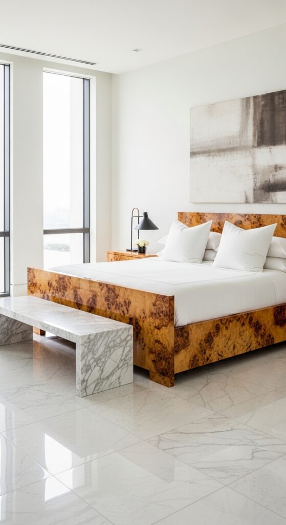 Burl wood is known for its swirling, marble-like grain patterns caused by “stress” in the tree. An organic bed made from burl wood is the height of luxury. The frame is kept simple—often a sleek, rounded rectangle—to let the chaotic, beautiful patterns of the wood do the talking. It’s a “maximalist-minimalist” dream. To the eye, it looks like a landscape painting captured in timber, making it the perfect focal point for a neutral-colored room.