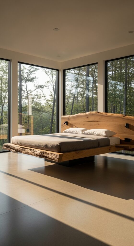 Imagine a thick slab of oak or cedar that looks like it’s hovering above the floor. By using a recessed pedestal base, this organic design highlights the raw, “live” edge of the wood—keeping the natural knots and cracks intact. It brings a rugged yet refined vibe to the room. The “floating” effect creates an illusion of more floor space, making it ideal for bedrooms that want to feel airy and expansive. It’s a conversation starter that celebrates the tree’s original life.