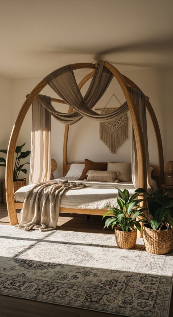 Taking the traditional canopy bed and giving it a botanical twist, the Cocoon Canopy uses steam-bent wood to create arched overhead rails. Instead of straight pillars, these supports mimic the reaching branches of a tree. It creates a “room within a room” feeling, providing a sense of security and intimacy. Stylistically, draping light linen fabric over these organic curves creates a dreamy, ethereal look that performs exceptionally well on social media feeds.