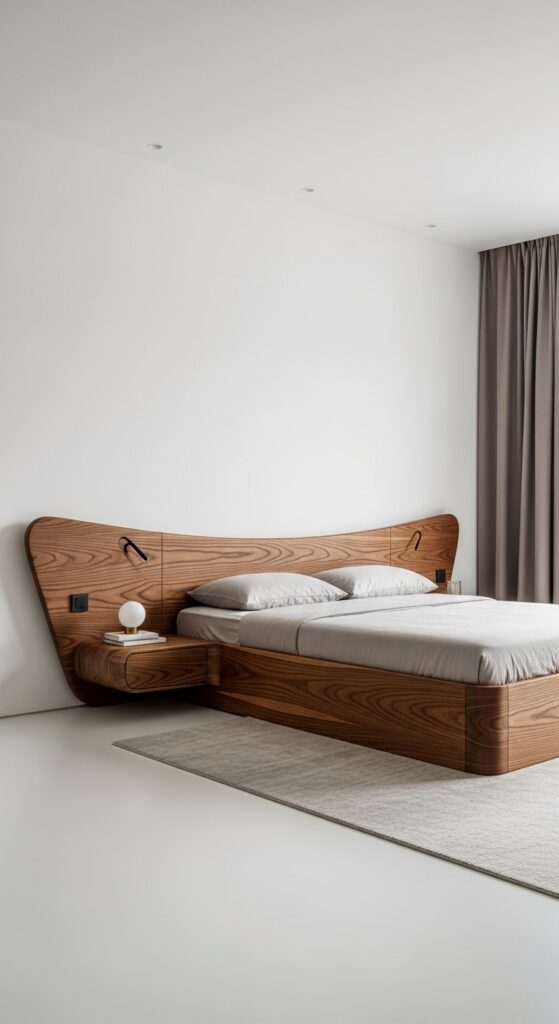 In this design, the bed and the side tables are one seamless entity. The wood flows out from the headboard like wings, curving forward to create floating bedside platforms. This eliminates the clutter of mismatched furniture and creates a “built-in” custom look. The lack of joints and seams gives the room a futuristic yet warm aesthetic. It’s perfect for minimalists who want a clean, organized look without sacrificing the warmth of natural timber.