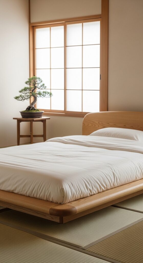 Inspired by Japanese minimalism, this bed sits very close to the ground. The frame extends several inches beyond the mattress, showcasing the wide grain of the wood. The corners are softly sanded into “pebble” shapes. This low center of gravity promotes a grounded feeling. When paired with a simple bonsai tree or a stone vase, this design transforms a standard room into a high-end spa retreat. It’s the ultimate choice for those who value simplicity and breathability in their decor.
